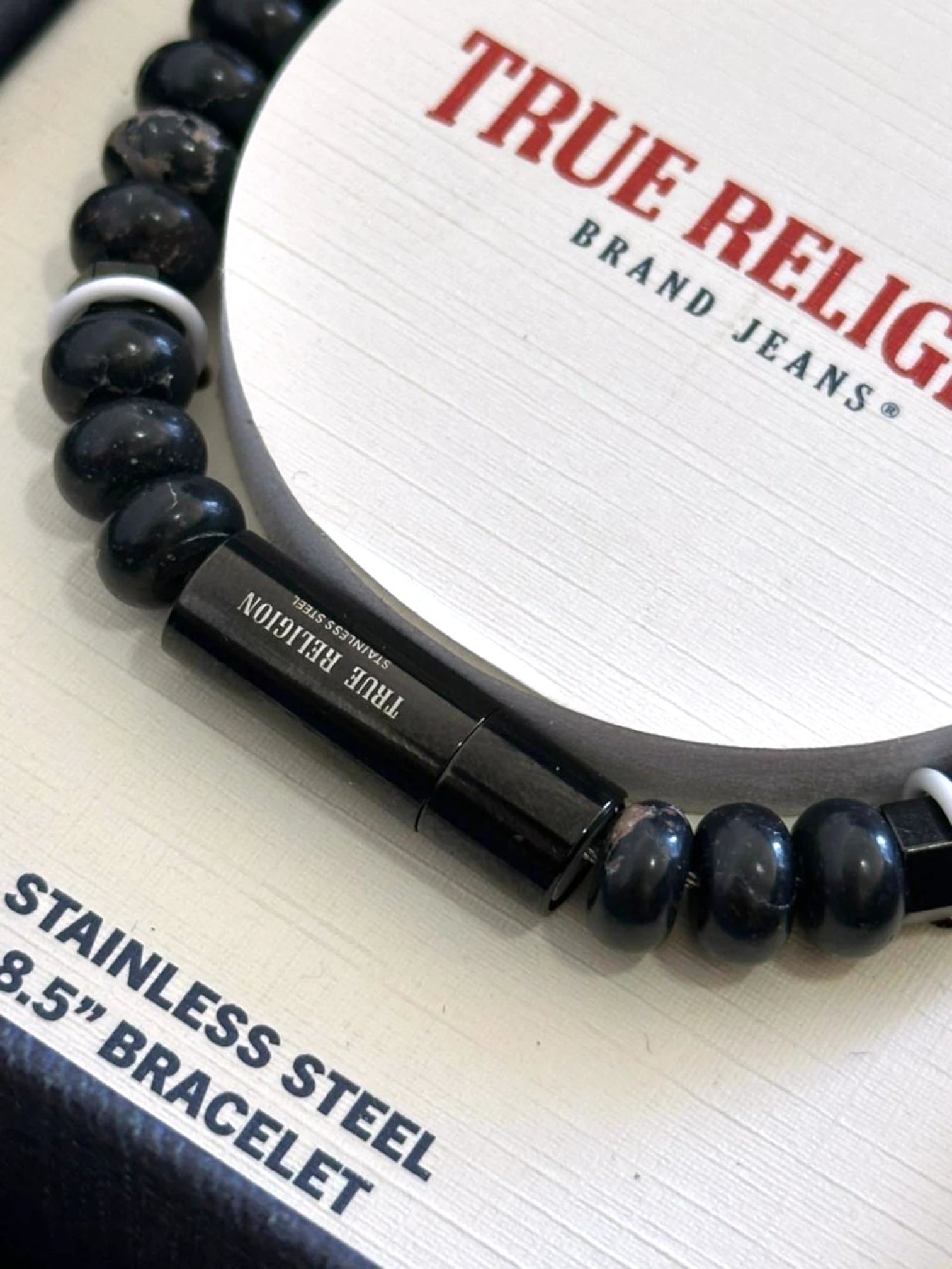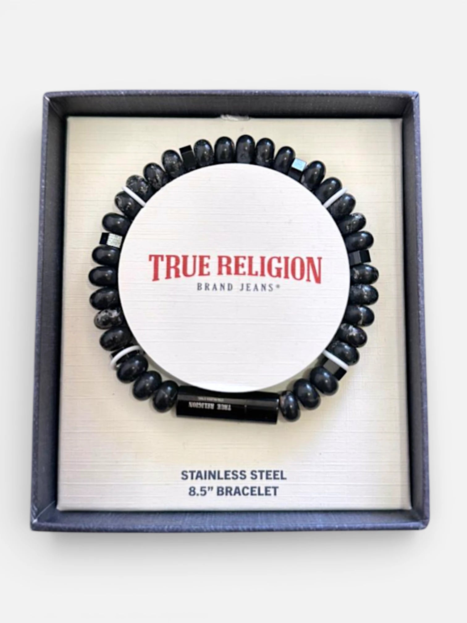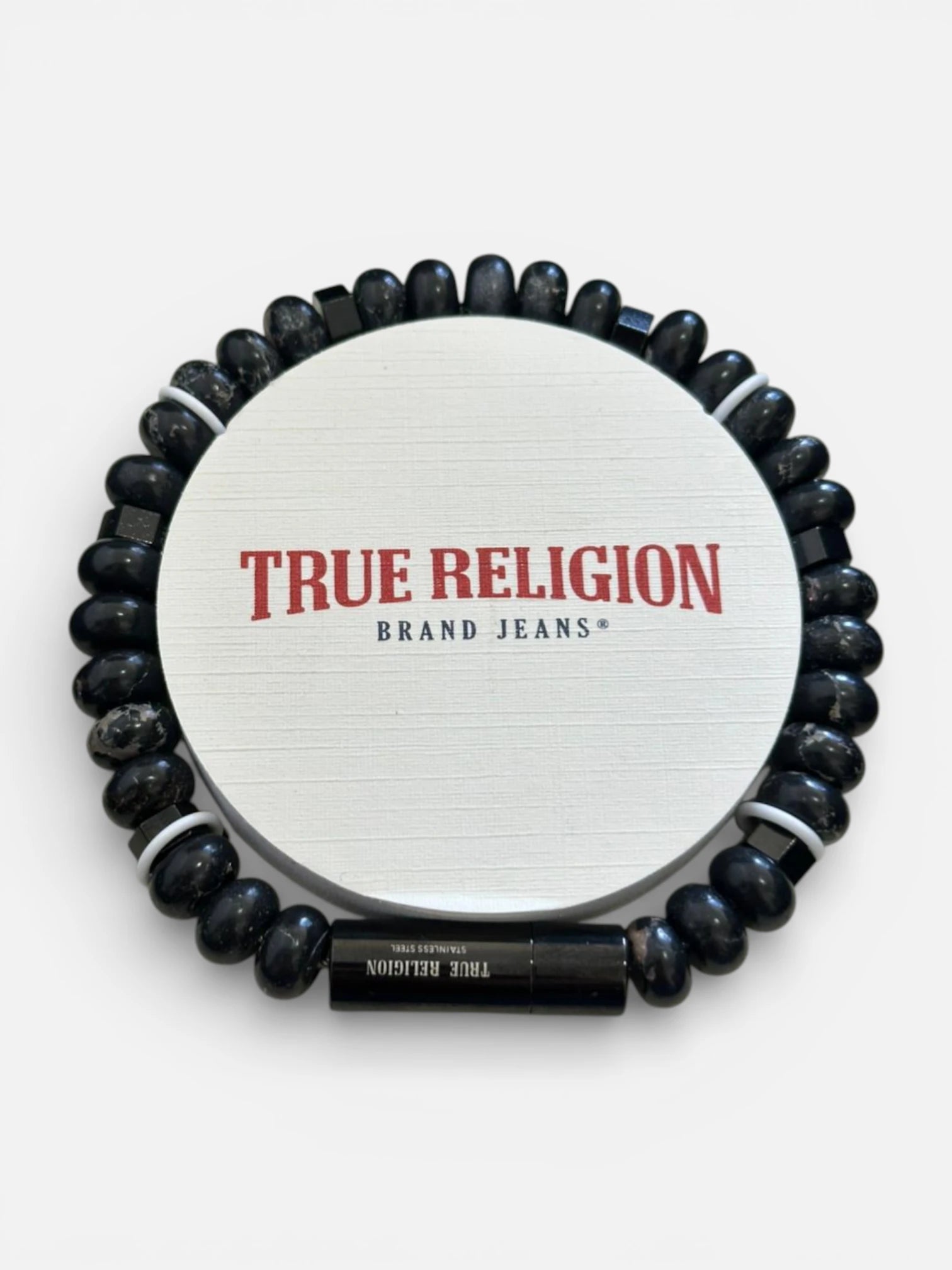 Brazalete True Religion en acero inoxidable con cierre magnético y ajuste seguro. Presenta el icónico logo de cruz en el enganche, combinando durabilidad y estilo premium. Con medida de 8.5", se adapta cómodamente a la muñeca. Ideal para complementar tu look streetwear con un accesorio versátil y de calidad que refleja la estética True Religion. Perfecto para uso diario o looks más elaborados.